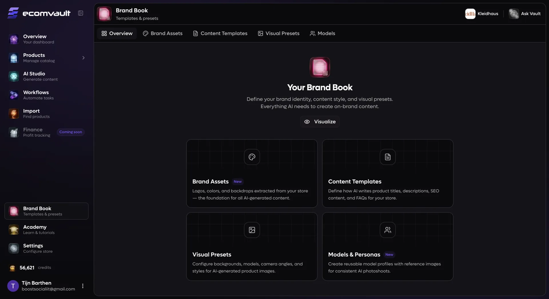 Most e-commerce sellers start the same way: source products, write quick descriptions, upload supplier photos, and hit publish. The result is a storefront that looks like every other reseller — generic titles, inconsistent tone, stock-quality imagery, and zero brand recognition. Customers scroll past because nothing stands out. As your catalog grows, the problem compounds. One product gets a polished description while the next reads like a spec sheet. Lifestyle photos use different models, lighting, and backgrounds from page to page. SEO metadata is an afterthought. You know your brand should feel premium, but enforcing that across hundreds or thousands of listings manually is not realistic. EcomVault solves this by letting you define your brand identity once — your visual assets, your voice, your content structure, your model personas — and then automatically applying it to every piece of content and imagery your store produces. The platform does not just generate content; it generates your brand, consistently, at whatever scale you need.